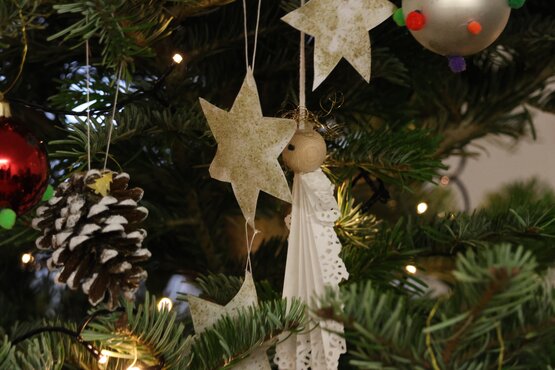 Wie fleißige kleine Bienchen schwirren die Jungen und Mädchen aus der OGS Friedrich-Grillo-Schule um den Tannenbaum im Vorraum an der Grenzstraße. Schnell einen Stern, eine Kugel oder einen Engel aus der Kiste geklaubt, die AWO-Kollegin Melanie Weckmann ihnen hinhält und schon geht es zurück zum Baum, um den schönsten Platz für die Dekoration zu finden.